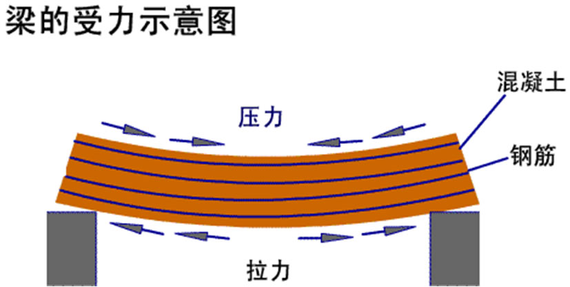 混凝土能承受壓力但不耐拉力,鋼筋則能承受較大的拉力。因此鋼筋混凝土梁能很好地解決荷載問題。