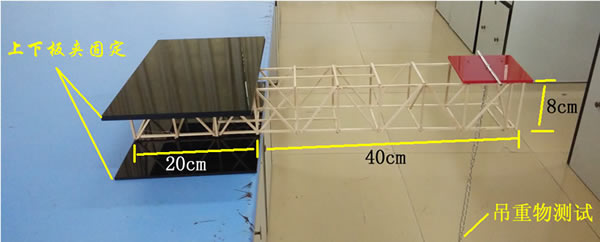 (3)測試原理:將懸臂梁一段(20cm)用上下兩塊板夾住固定在測試臺(tái)上,另一段(40cm)懸空,在其末端的上面壓上一塊邊長10cm的正方形板,板下面吊上重物進(jìn)行承重測試(見示意圖),直到斷裂(或下降10cm),以承重量大小確定成績。