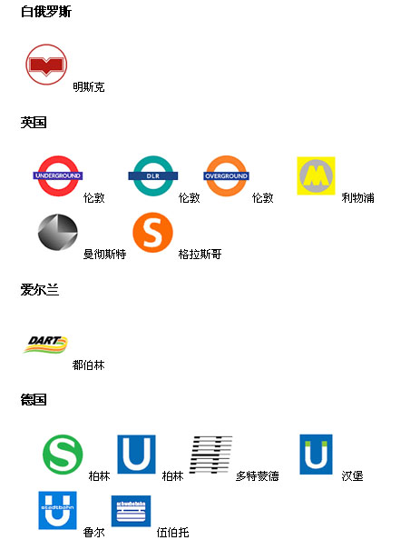 “地鐵”在全球大多數(shù)國(guó)家中都叫做“metros”(只有很少一部分國(guó)家的地鐵叫做subway, underground, U-Bahn, T-bana或者其它),大多數(shù)地鐵都會(huì)把LOGO標(biāo)志設(shè)置在入口,或者印在車廂,路線圖和車票上。所以地鐵的標(biāo)志多少都和“metros”中的“m”有關(guān)。