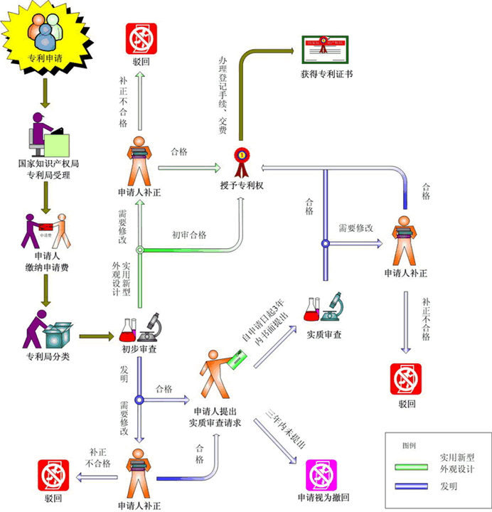 發(fā)明、實用新型和外觀設(shè)計專利的申請、審查流程圖如下: