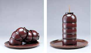 將數(shù)個(gè)木碗重疊并倒扣在一個(gè)盤子上,如果晃動(dòng)盤子,木碗就會倒塌(左)。而如果按所謂「哥倫布的雞蛋」(即哥倫布磕碎雞蛋底部讓雞蛋立起的故事)那樣的思路,在每只木碗的底部開一小洞,并用一根筷子串起來,這樣,即使晃動(dòng)盤子,上面的木碗也不會倒塌(右)。