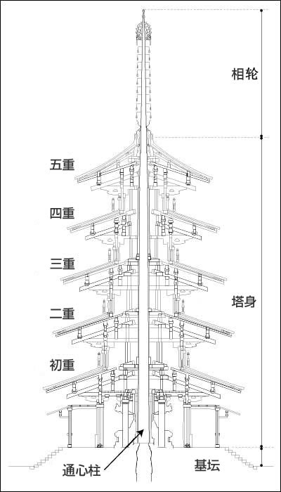 所謂通心柱,是縱貫塔身的粗大木柱,日本的五重塔或是三重塔都有通心柱,但在中國和韓國現(xiàn)存的木塔中卻很少見。有人認(rèn)為通心柱是日本木結(jié)構(gòu)佛塔的特點(diǎn)。。