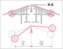 有人也許會擔(dān)心,重疊的各個(gè)建筑體如果僅是緩緩地?fù)u晃則不要緊,但如果是急劇搖晃,整個(gè)建筑是否就有傾斜而倒塌的危險(xiǎn)。曾經(jīng)有一位專門修建神社、宮殿建筑的木匠在大地震發(fā)生時(shí)偶然望見五重塔的各層建筑體以相互交錯(cuò)的方向(即下層向左,上層向右,再上層又是向左)在傾斜、搖晃,整個(gè)五重塔就像是在扭蛇舞(見圖1)。大小不同的各重構(gòu)筑體以所謂的「彌次郎兵衛(wèi)平衡原理」(即左右重心平衡,見圖2)所產(chǎn)生的復(fù)原作用而相互錯(cuò)向搖動(dòng),這就是五重塔不倒的原因之四。