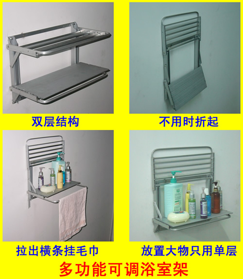 我們設(shè)計制造了一個可調(diào)節(jié)的多功能浴室架。該浴室架具有普通浴室架無法比擬的優(yōu)點。它的特點如下: