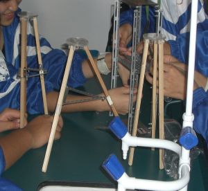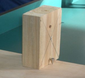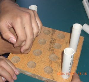 在一塊木板的一面鉆上不同分布的孔,當(dāng)支柱裝插在外側(cè)或內(nèi)側(cè)時(shí)。改變了支撐面積的大小,分別讓學(xué)生放在三夾板上,使三夾板傾斜,看哪個(gè)先倒,檢測出支撐面的大小對穩(wěn)定性的影響,當(dāng)采用不同高、低的支柱時(shí)還可以用來檢測重心高低對穩(wěn)定性的影響。