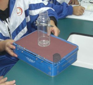 該教具利用兩個(gè)礦泉水瓶,一個(gè)在里面放了幾張紙,另一個(gè)在紙張上再放上兩個(gè)鐵塊,然后把兩個(gè)不同重心高度的礦泉水瓶放到一塊三夾板上,當(dāng)抬起三夾板的一頭,使三夾板傾斜,看哪個(gè)瓶容易倒,同樣達(dá)到檢測重心的高低對穩(wěn)定性的影響。