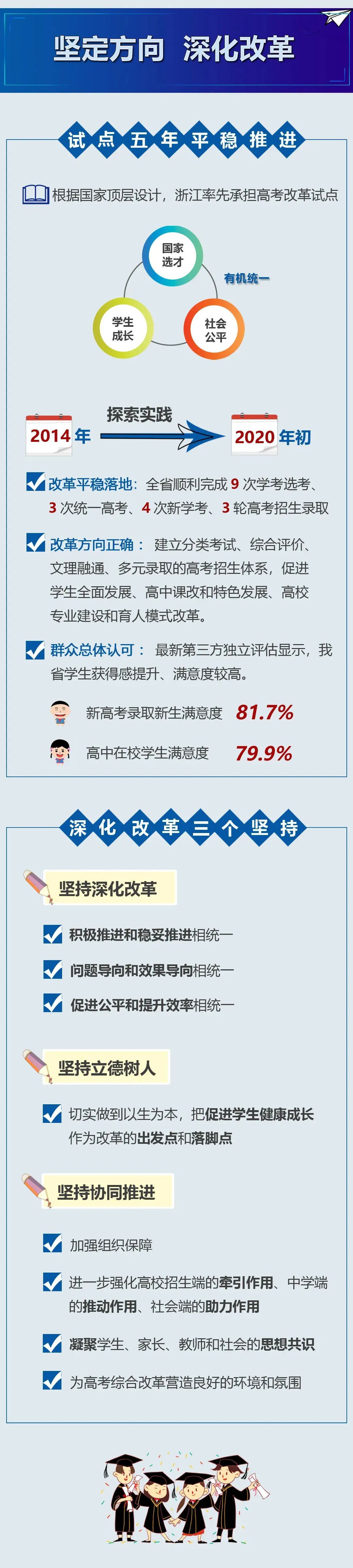 主要體現(xiàn)在:一是改革平穩(wěn)落地。圍繞“實(shí)現(xiàn)學(xué)生成長(zhǎng)、國(guó)家選才、社會(huì)公平三者有機(jī)統(tǒng)一”要求,我省積極穩(wěn)妥推進(jìn)改革完善舉措,現(xiàn)已順利完成三輪高考招生錄??;從歷次調(diào)研及第三方獨(dú)立評(píng)估看,對(duì)改革成效是有共識(shí)的。