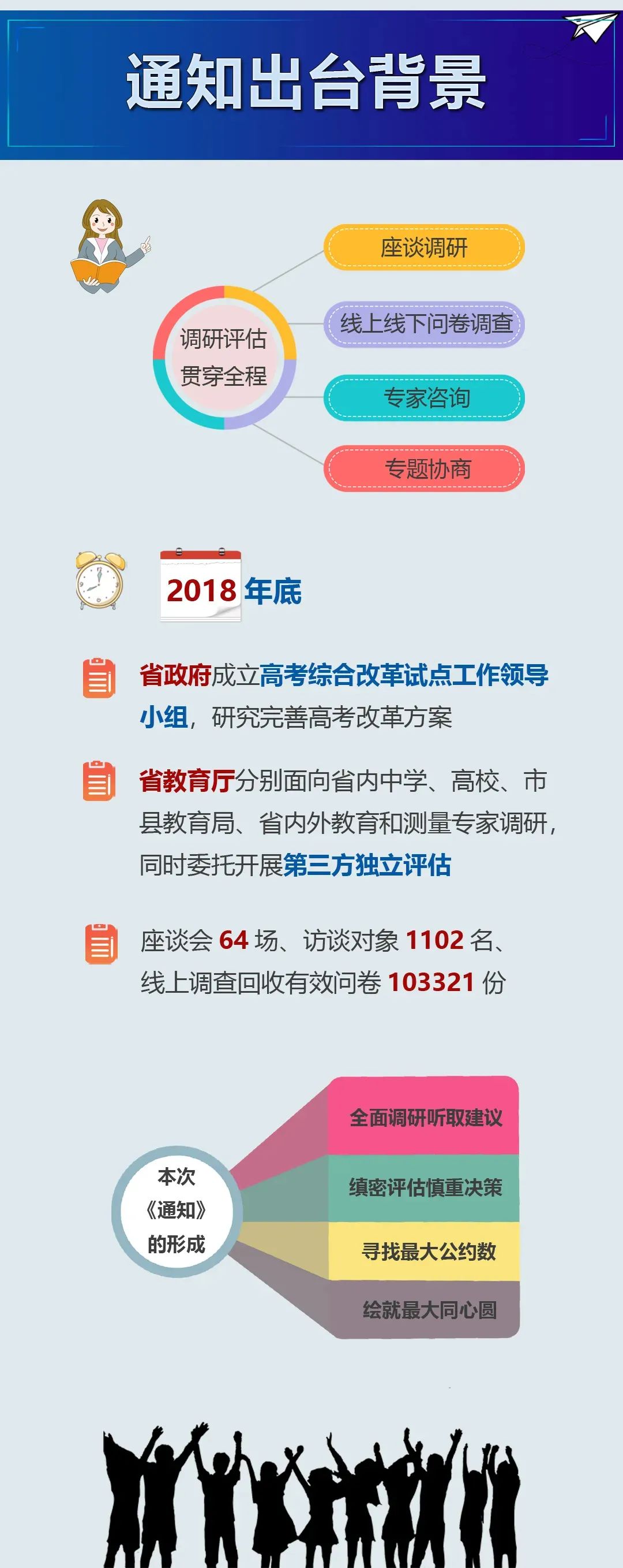 主要考慮:堅(jiān)持深化改革,努力實(shí)現(xiàn)積極推進(jìn)和穩(wěn)妥推進(jìn)相統(tǒng)一、問題導(dǎo)向和效果導(dǎo)向相統(tǒng)一、促進(jìn)公平和提升效率相統(tǒng)一。堅(jiān)持立德樹人,切實(shí)做到以生為本,把促進(jìn)學(xué)生健康成長(zhǎng)作為改革的出發(fā)點(diǎn)和落腳點(diǎn)。堅(jiān)持協(xié)同推進(jìn),加強(qiáng)組織保障,進(jìn)一步強(qiáng)化高校招生端的牽引作用、中學(xué)端的推動(dòng)作用、社會(huì)端的助力作用,凝聚學(xué)生、家長(zhǎng)、教師和社會(huì)的思想共識(shí),為高考綜合改革營(yíng)造良好的環(huán)境和氛圍。