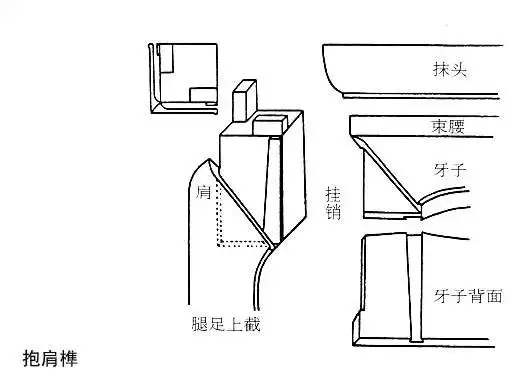 指有束腰家具的腿足與束腰、牙條相結(jié)合時(shí)所用的榫卯。從外形看,此榫的斷面是半個(gè)銀錠形的掛銷(xiāo),與開(kāi)牙條背面的槽口套掛,從而使束腰及牙條結(jié)實(shí)穩(wěn)定。抱肩榫的做法采用45°,榫肩出榫和打眼,嵌入的牙條與腿足構(gòu)成同一層面,是有束腰的明清家具的常用卯榫構(gòu)造。